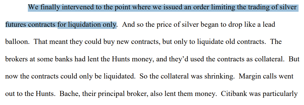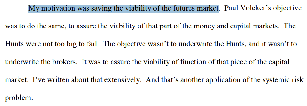 In the case of silver, the objective was not to preserve any individual participant, but to preserve the system itself. As Andrew Brimmer later reflected, the priority was “saving the viability of the futures market”—not the fortunes of those within it. Measures such as restricting trading to liquidation-only were not taken to express market opinion, but to stabilize a structure considered too important to fail. The implication is difficult to ignore.