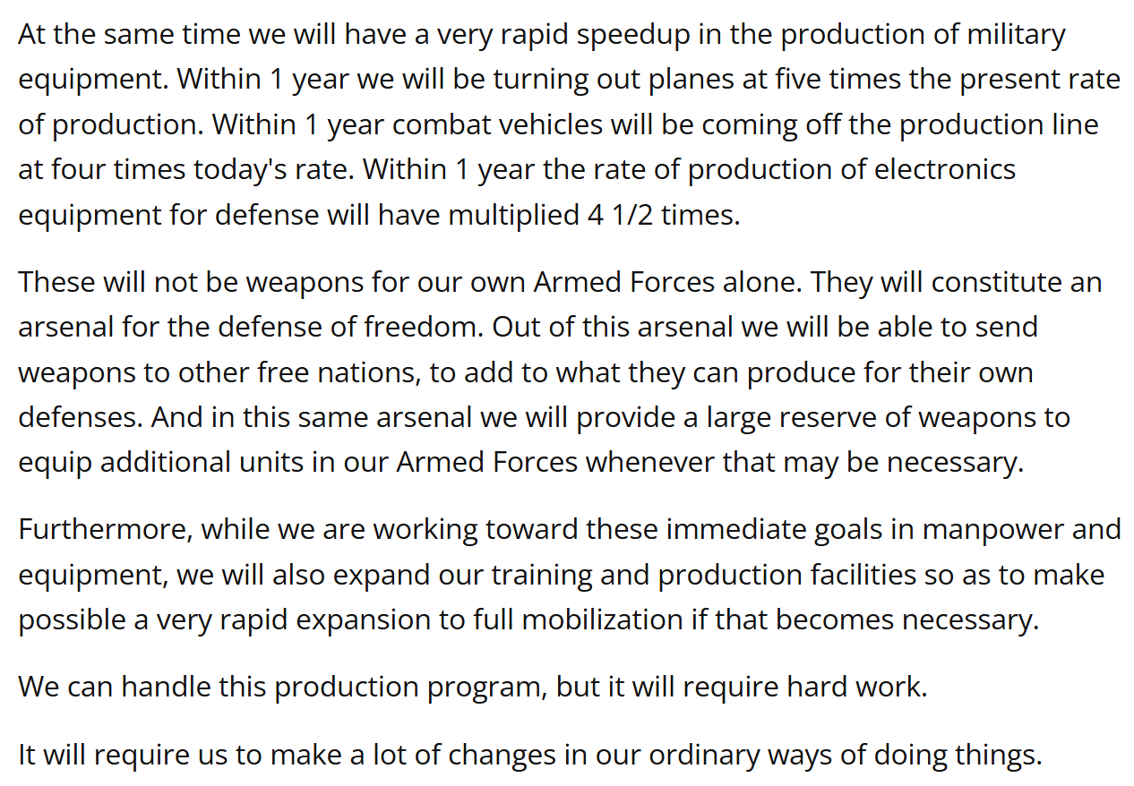 In his address to the nation the night before the proclamation, Truman made clear that the United States was preparing for something beyond a limited conflict. The required buildup would not simply match World War II—it would exceed it in scope, duration, and complexity.