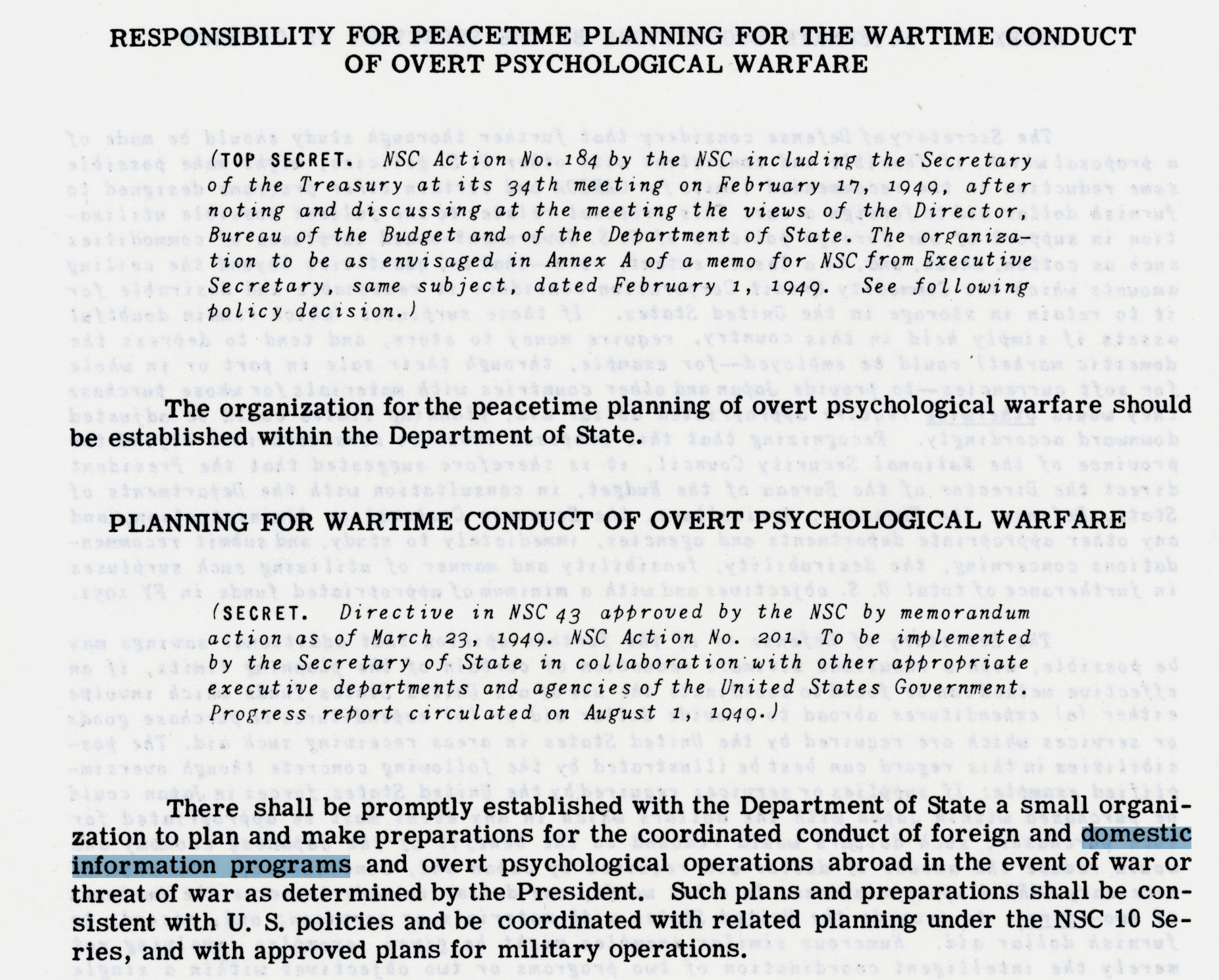 Policy frameworks of the period, including NSC 43, made clear that communication was not incidental to strategy—it was part of it. Information, both abroad and at home, was to be coordinated alongside military, industrial, and economic objectives. Planning for “domestic information programs” was embedded within the same operational structure as foreign psychological efforts, reflecting a unified approach to managing perception in parallel with material capacity.