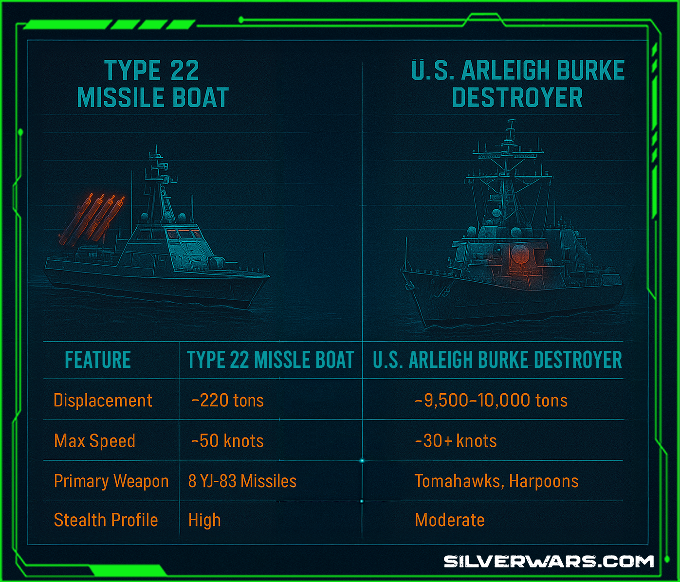 Recent intercept operations by the Type 22 demonstrated that speed, stealth, and swarm tactics can close the gap against heavier U.S. forces operating near contested islands and reefs.