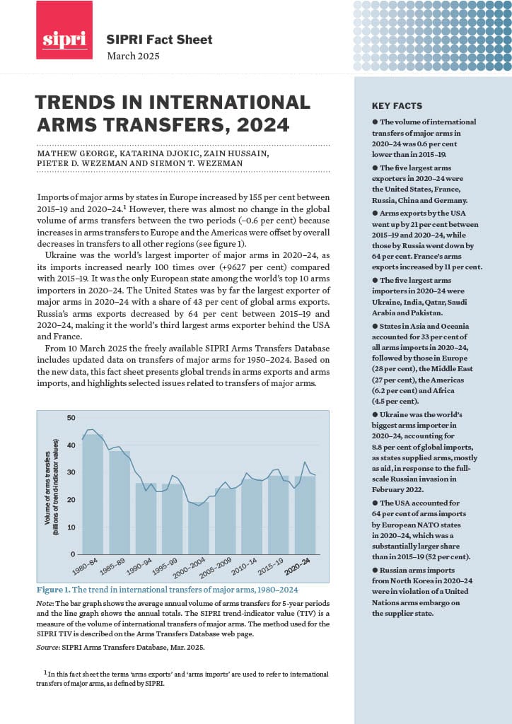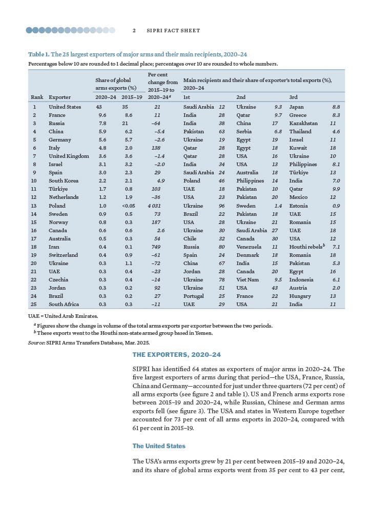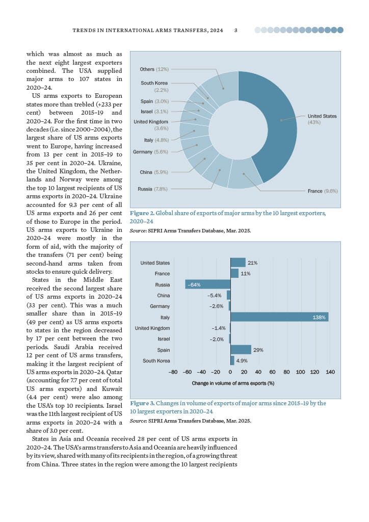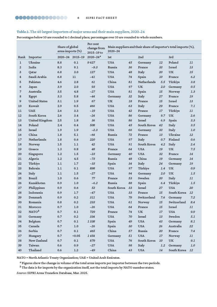 While the U.S. tries to refill its own magazines, allied demand is surging. SIPRI’s 2025 data show Ukraine became the world’s #1 arms importer (8.8% of global) in 2020–24, with about 45% supplied by the U.S. European NATO states also doubled imports versus 2015–19. These aren’t paper orders; they sit on the same U.S. lines making our own missiles and aircraft.