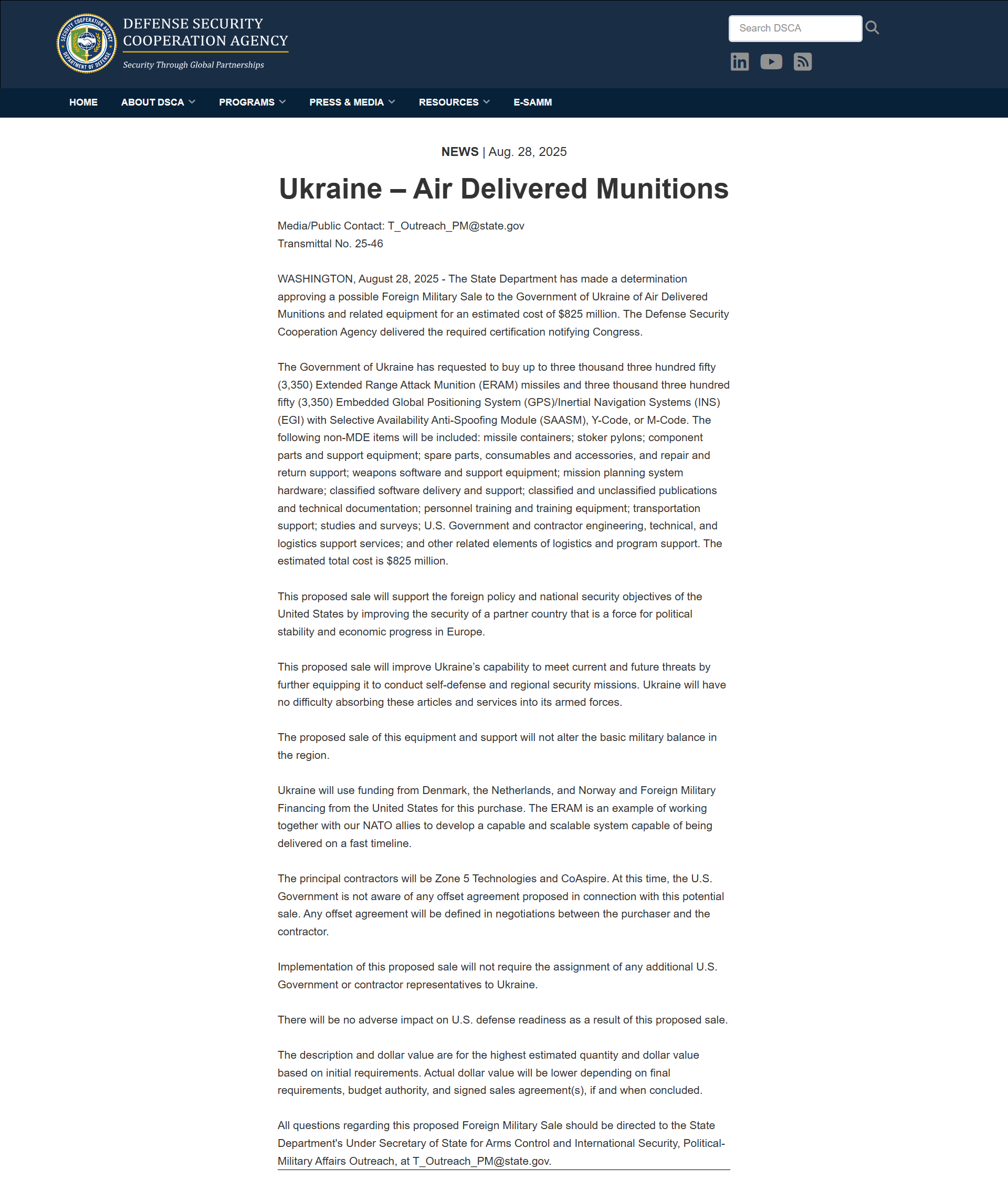 Case in point: in August 2025 the State Department cleared a package for 3,350 Extended‑Range Attack Munitions (ERAM) to Ukraine—thousands of precision air‑launched missiles pulling from limited avionics, seekers, and energetics supply. Official notices always say “no adverse impact on U.S. readiness,” but physics and factory calendars disagree.