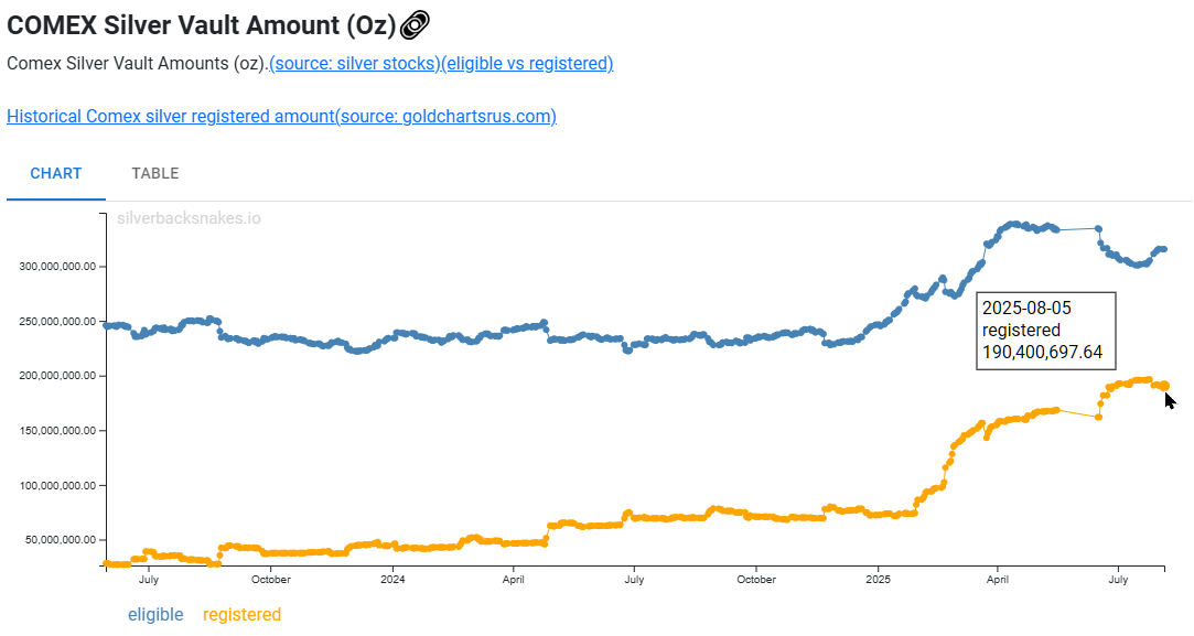 London's bullion vaults (the LBMA), traditionally the deepest pool of silver, have likewise shed over 300 million since 2021, dropping their reported holdings from ~1.2 billion oz to under 900 Moz. Crucially, most of this remaining silver may not truly be "available". In COMEX warehouses, only 47 million oz are classified as deliverable "registered" metal, with the rest tied up in "eligible" storage and unlikely to hit the market unless owners choose to sell. The LBMA does not disclose how much of its stash is spoken for, but as one report noted dryly, "it is almost certainly for less than the reported total."