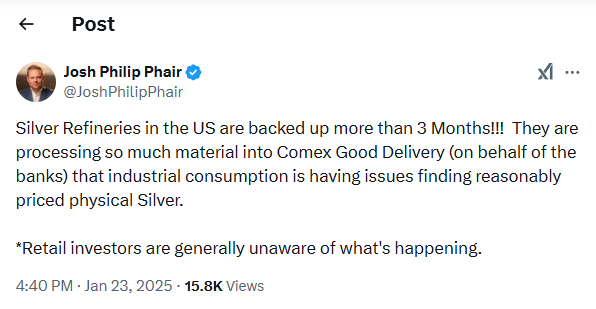 Additionally late last week, Founder and CEO of Scottsdale Mint Joshua Phair came out Thursday to sound the alarm that production of new silver supply is backed up more than 3 months.