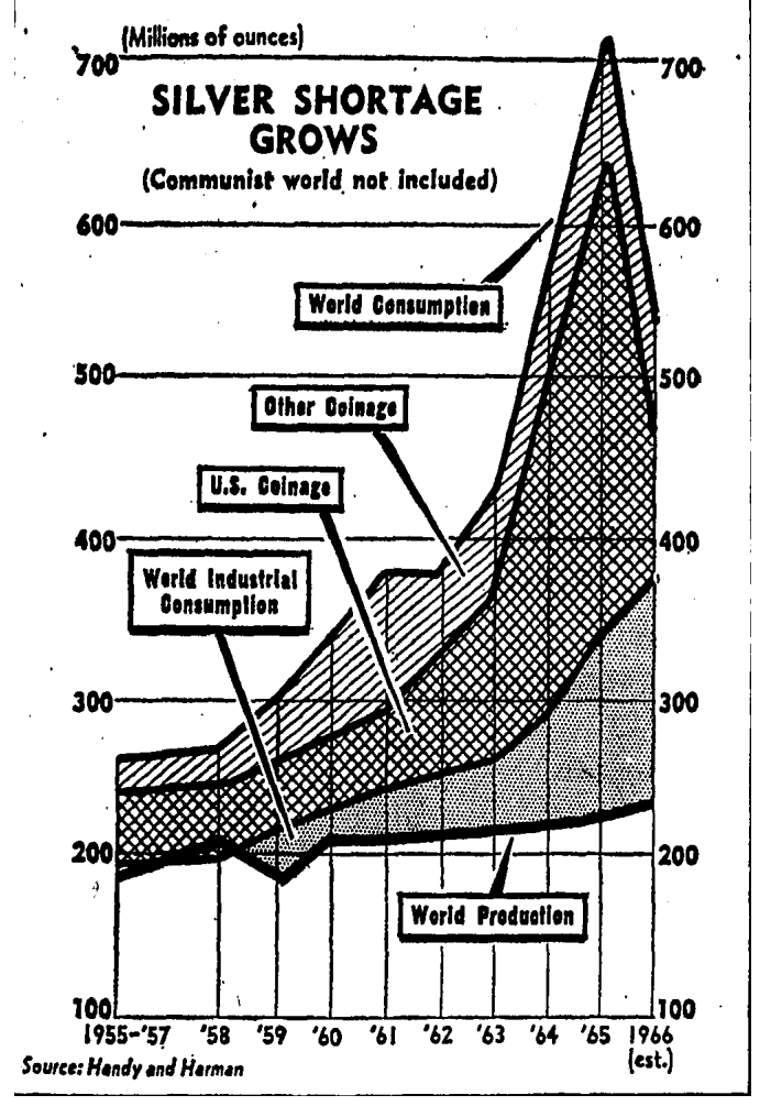 Coinage and industrial consumption in the non-Communist world, moreover, was about 500 million ounces, while world production lagged behind at 250 million ounces.