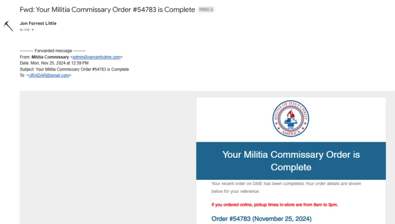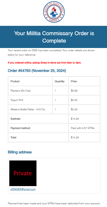 Jon excitedly shared with us his recent order using Tim's DME system to purchase some goods at the 'Militia Commissary' using his silver he gave to Tim.