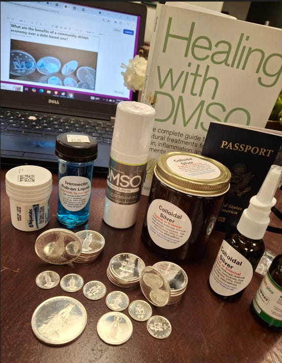Jon (6:03-6:37): Oh let me show you some of these– and there's like– there's the colloidal silver– here's the– yeah– this stuff is called 'DMSO'– I don't know what it does, but its– I'm reading this dumb book called "Healing with DMSO"– its like an anti-inflammatory– here's uh– here's uh colloidal silver in a spray– you know like–