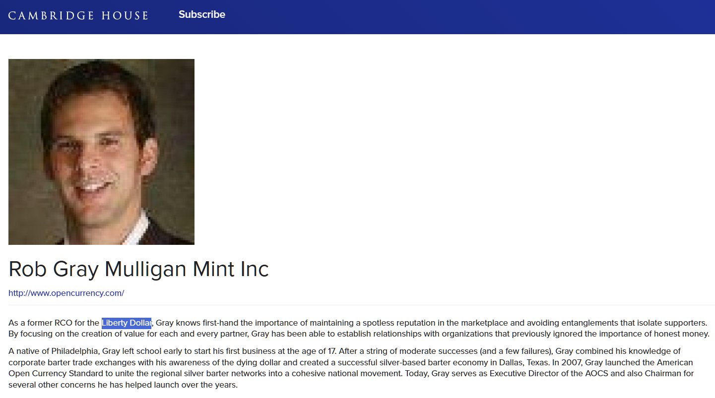 Our team identified that individual as Robert Gray of Mulligan Mint, who was a former RCO for the Liberty Dollar.