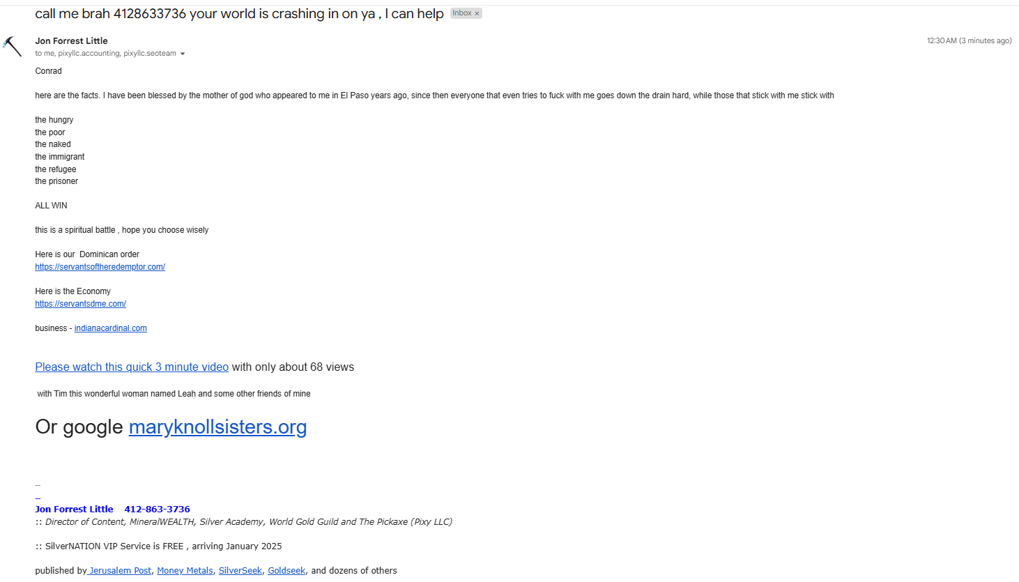 For most of the last month we have legally recorded all business conversations with Jon Little, investigated what he said, and saved all documentation to protect ourselves and this sector from a situation that has escalated to the literal twilight zone of Federal no-no(s) and we believe even breaks Canon laws (Church laws).