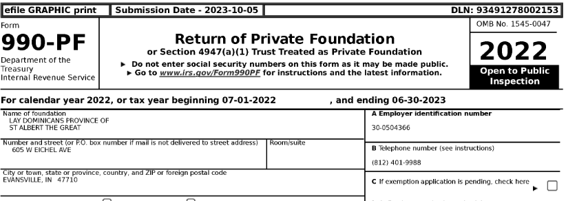We discovered their latest 990s form was filed as "Lay Dominicans Province of St. Albert the Great." The address on the form matches the same for Martin Holding Company/Indiana Cardinal.
