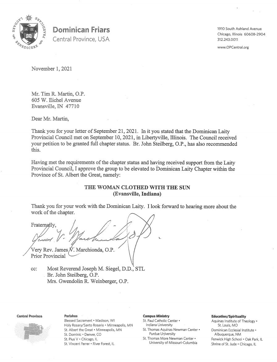 This Chapter has been officially approved within the Province of St. Albert the Great, per its approval letter.