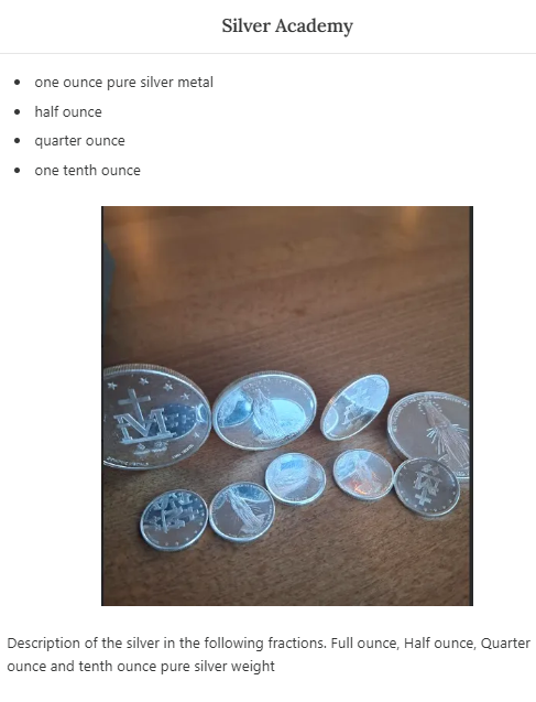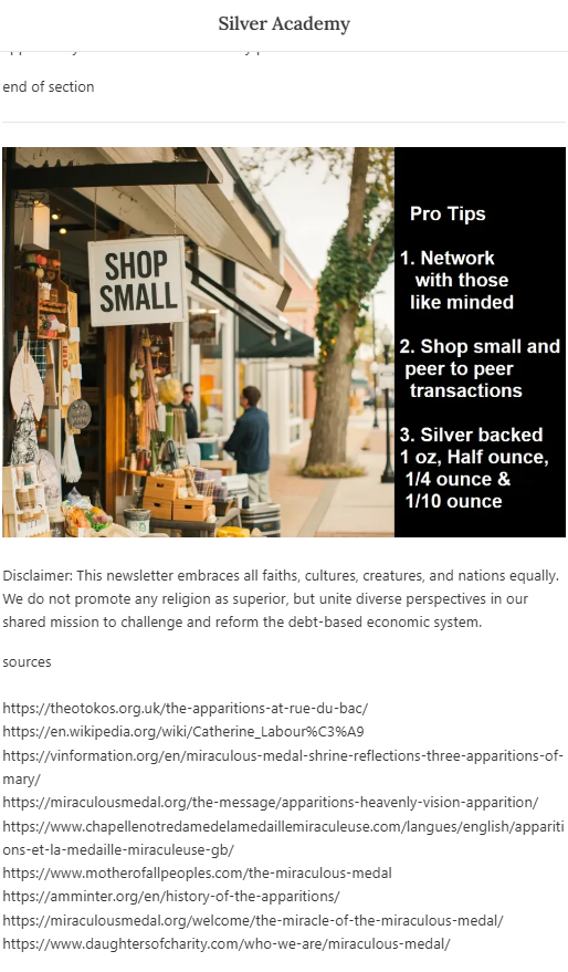Jon sends us a copy of his interview with Peter Grandich where he talks about knowing of a place where they mint ounce, half ounce, quarter ounce, tenths and using silver as money through 'our' store, through 'our' cafe' and mentions they can even fill up their [gas] tank with it. Then they discuss what the 'Miraculous Medal' is from the religious aspect.