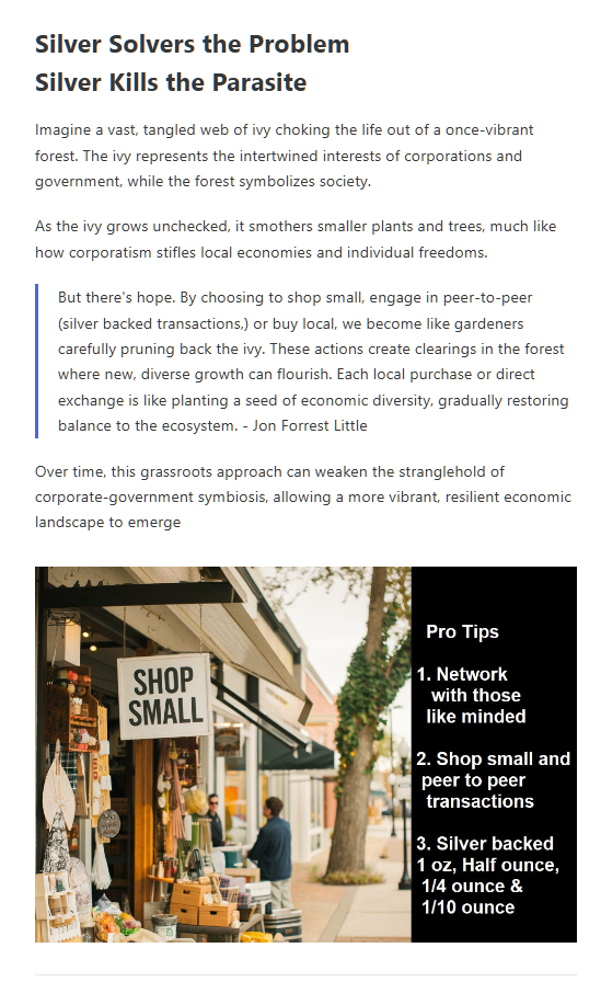 Over time, this grassroots approach can weaken the stranglehold of corporate-government symbiosis, allowing a more vibrant, resilient economic landscape to emerge - Jon Forrest Little, from his Silver Academy.