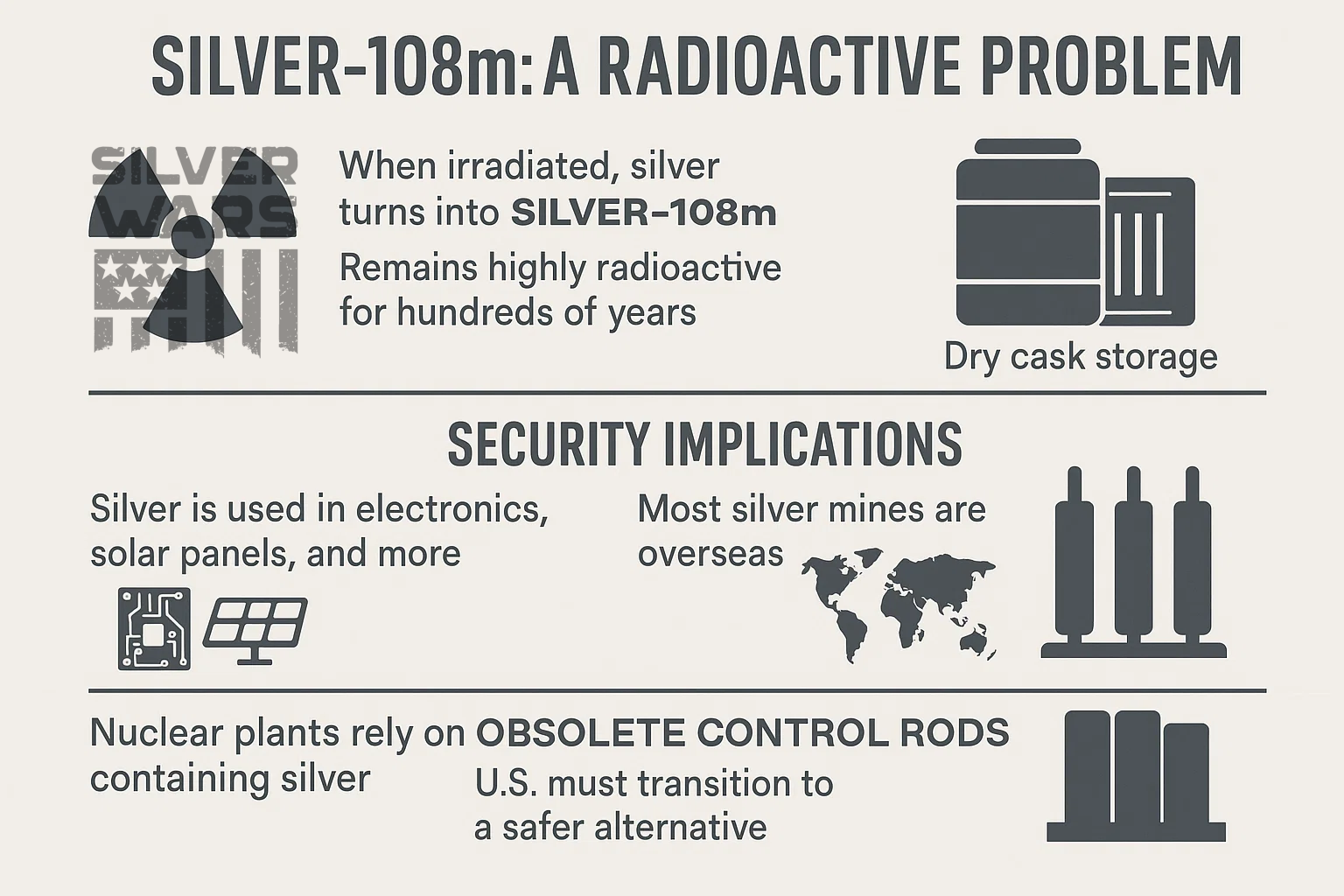 We examined the scale of silver use, its consequences for energy security, and lay out this clear solution: transition civilian PWRs to hafnium-based control rods immediately! The US does not produce enough silver domestically to maintain the Nuclear Energy grid.