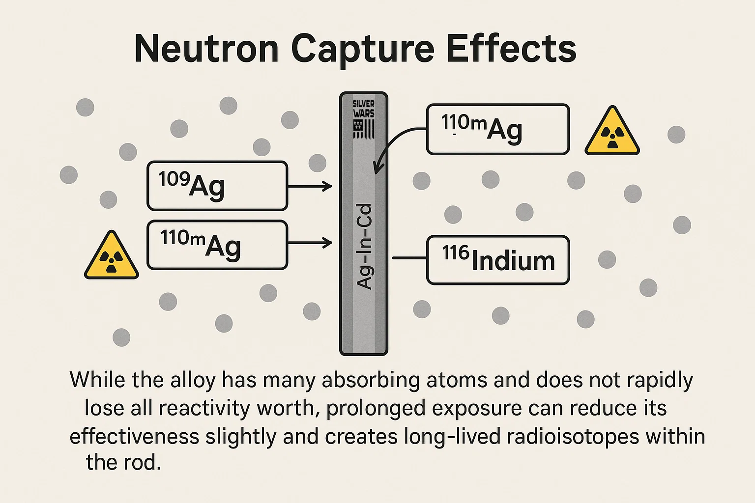 As control rods absorb neutrons, certain isotopes transmute. In Ag-In-Cd rods, silver-109 can capture neutrons and form silver-110m and silver-108m (radioactive isotopes), indium becomes indium-116, cadmium isotopes transmute, etc. While the alloy has many absorbing atoms (and does not rapidly lose all reactivity worth), prolonged exposure can reduce its effectiveness slightly and creates long-lived radioisotopes within the rod. (In practice, PWR control rods are usually fully withdrawn during normal full-power operation, so they are not continuously absorbing neutrons; this means neutronic depletion of PWR rods is very slow. PWR rods are primarily inserted for startup, shutdown, or power transients, unlike BWR rods which stay partially inserted and deplete faster.)