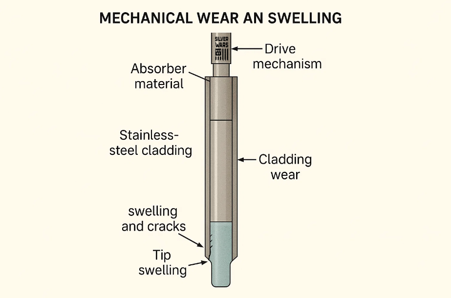The more significant life-limiting factor is mechanical. The absorber material swells and cracks with neutron irradiation, especially at the tips which see the highest flux. The stainless-steel cladding can also undergo irradiation-assisted stress corrosion cracking and wear from rubbing in guide tubes. PWR rods are held by drive mechanism and moved in and out; over years of serve, wear at the rod surfaces and guide tube interface can become an issue. Inspections often find tip swelling and cladding wear as the primary aging issue for Ag-In-Cd rods.