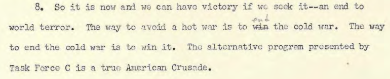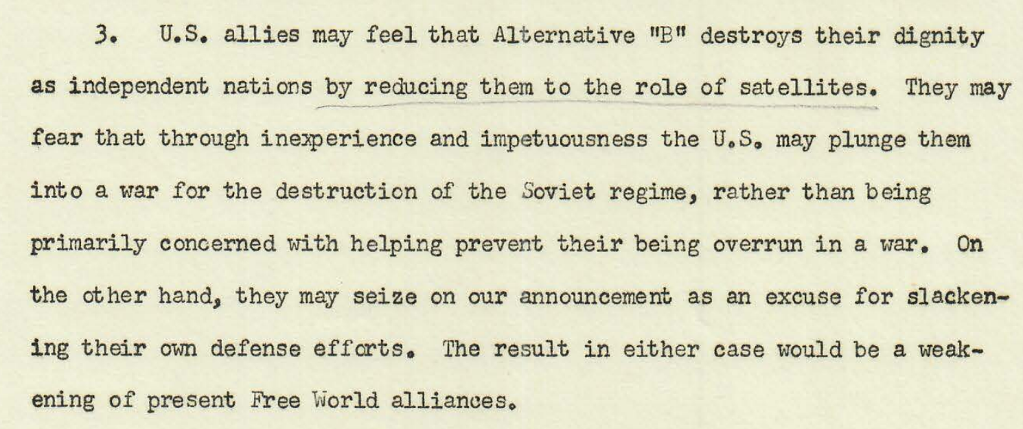This included direct efforts to destabilize opposing powers, encourage internal dissent, and weaken adversaries from within. The strategy openly acknowledges the risks involved, including the possibility that such actions could significantly increase the likelihood of general war. This is not framed as a failure of the system, but as a cost of maintaining it.