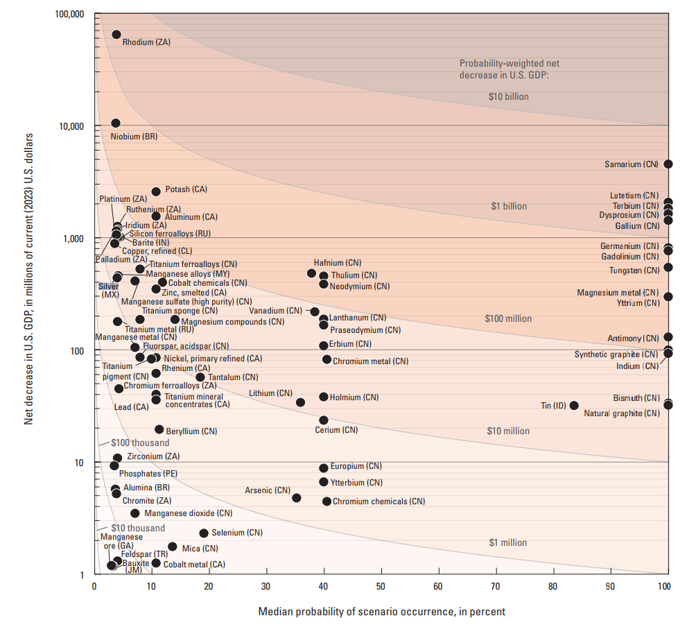 USGS Modeled more than 1,200 year long-trade-disruption scenarios across 84 mineral commodities and measured their probability-weighted impact on US GDP using detailed 2023 input-out tables. A mineral was recommended for inclusion if its expected, annualized GDP hit exceeded a set threshold (>$2 million) or if the US supply chain had a single point of failure domestically.