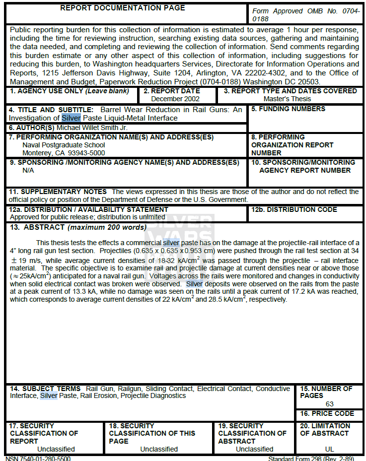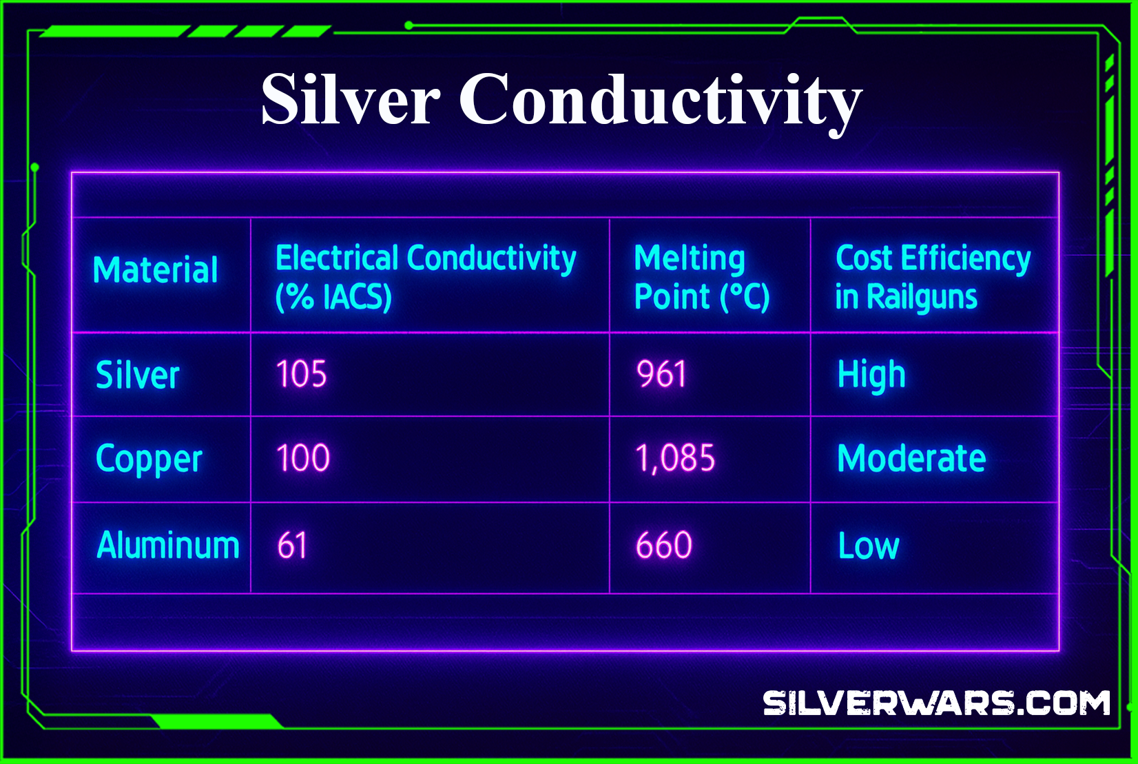 What matters most isn't just raw conductivity, but heat dissipation and system durability. The rails and the armature both face massive wear from not just friction but extreme electric arcing. The 2012 patent goes deep into this. Arcing and ohmic heating destroy most metals at high voltages. Silver's properties extend the lifespan of each shot—and make it reusable.