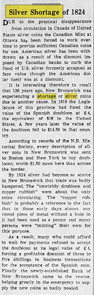1960-- “Silver Shortage of 1824” — Canada flags coin scarcity as banks discount U.S. silver. History rhymes: in 1824 New Brunswick’s silver fled to Boston/NY after a Spanish doubloon revaluation, stalling trade until the Bank of New Brunswick restored coin supply.