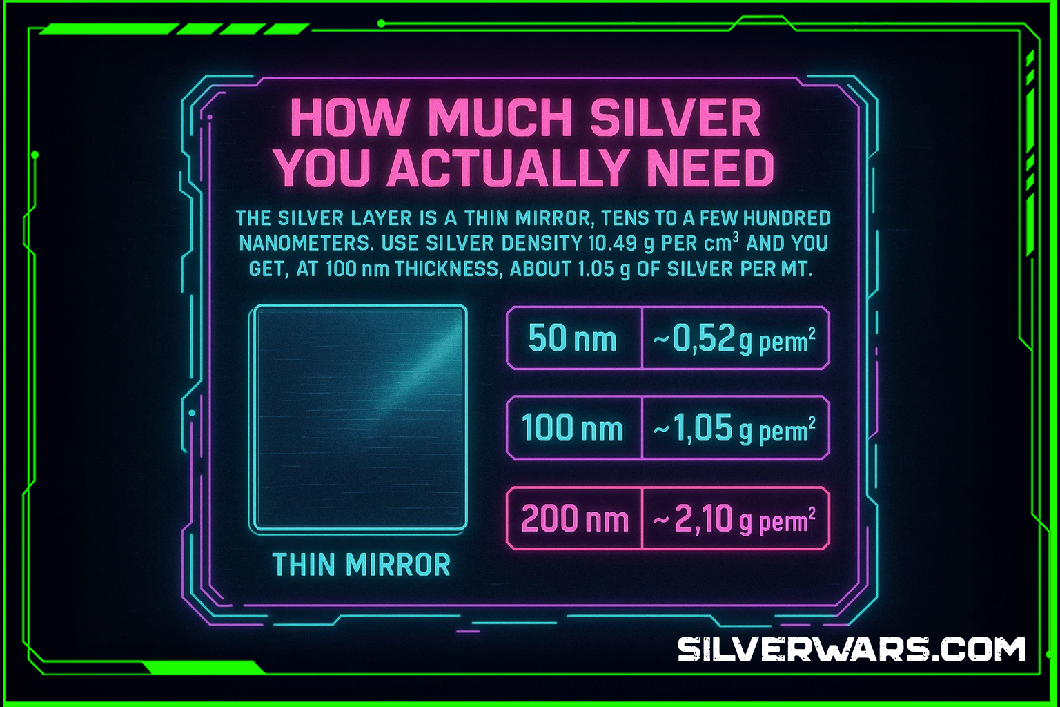- Silver mass check at 0.5 m² and 100 nm, about 0.5 g of Ag.