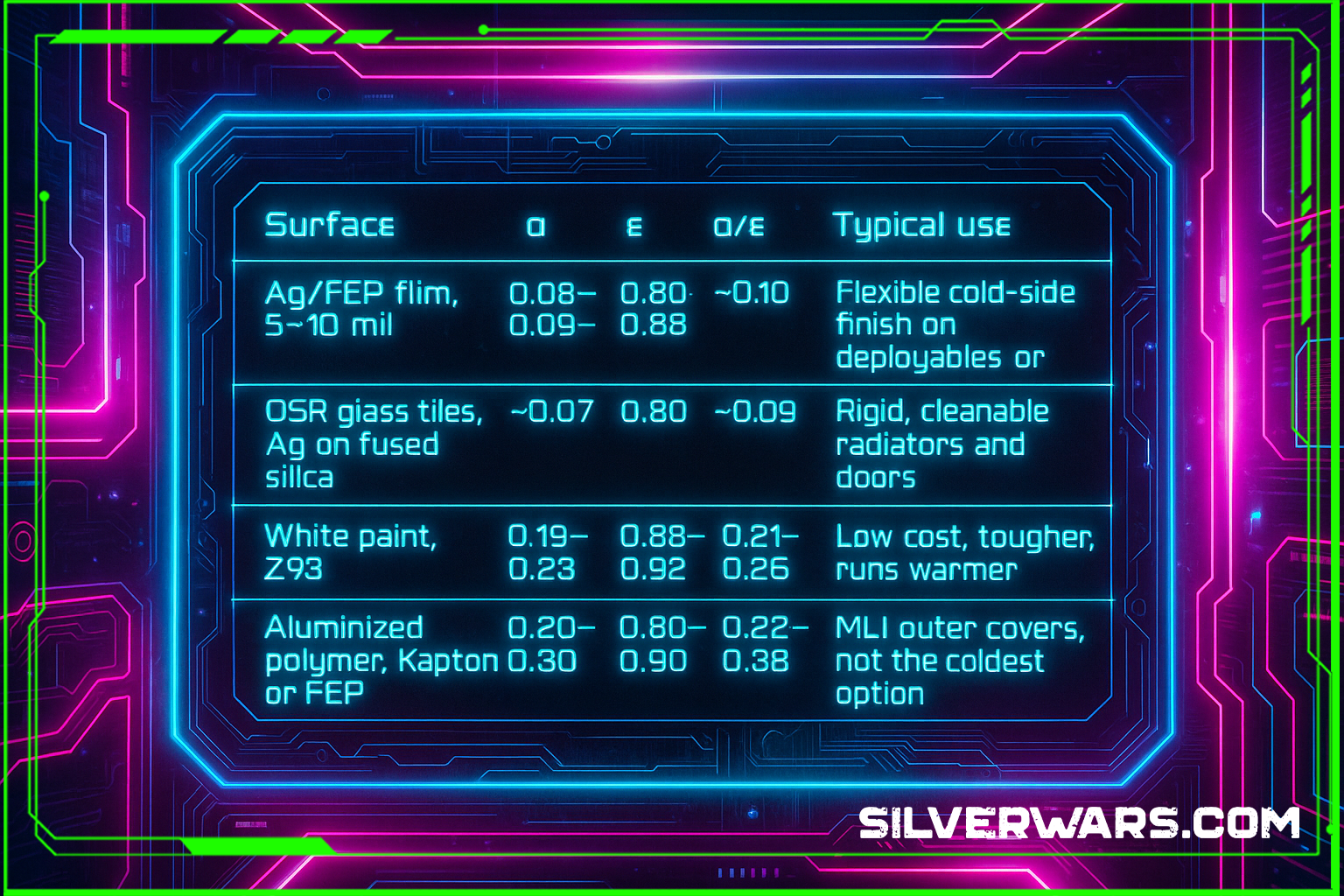 Aim for α/ε near 0.10, that is the cheat code for cool hardware. Ag/FEP and OSR give you that, with grams of silver across entire radiators. Lock the coating stack early, line up two vendors, test your lot at relevant temperatures and fluence.