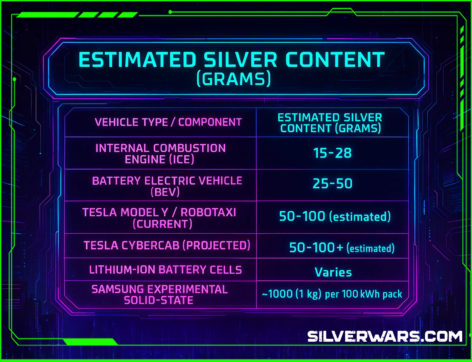 - If they ever reach their 2 million Cybercabs per year target for volume production: 2,000,000 vehicles×75 grams/vehicle=150,000,000 grams of silver That's 150,000 kilograms, or approximately 4.8 million troy ounces of silver annually.