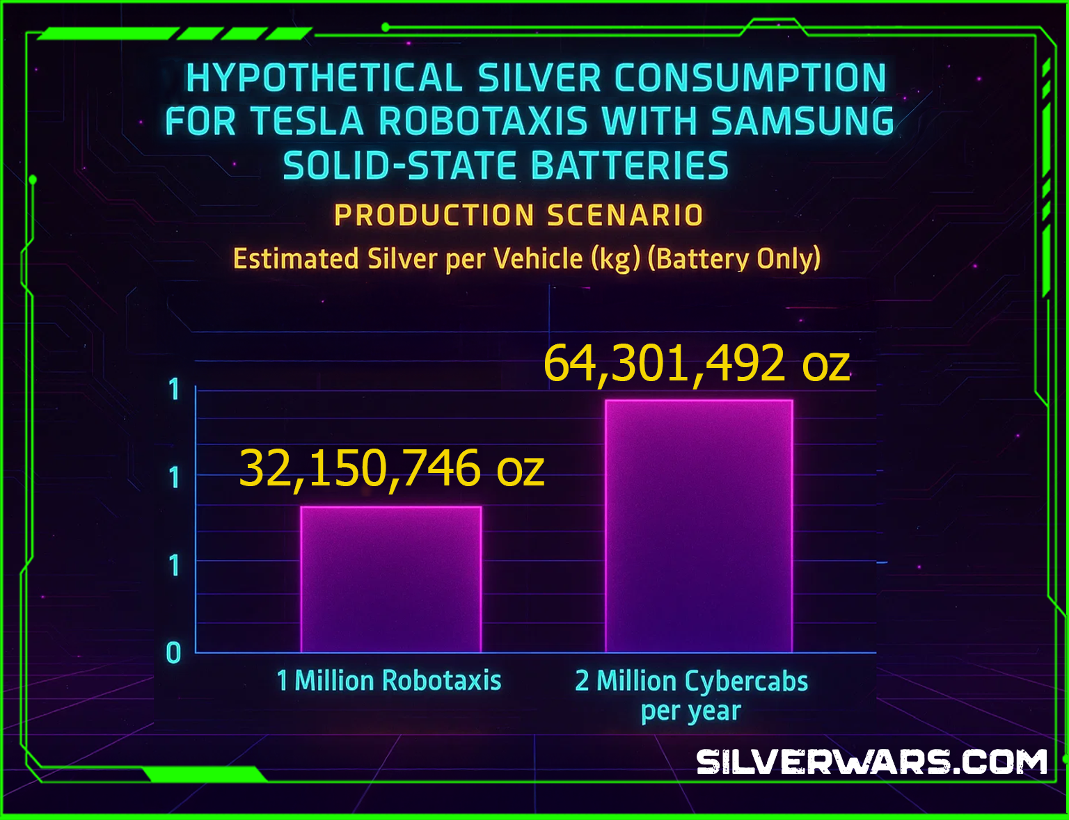 These figures are would/can be staggering. If Tesla were to hit its "ambitious" targets of 1 million or even 2 million robotaxis annually (it will not), and if each of those vehicles used a 100 kWh Samsung silver-carbon solid-state battery, we'd be talking about millions, even tens of millions, of troy ounces of silver just for the batteries. To put that into perspective, the annual global silver mine production is typically around 800-900 million troy ounces,. A demand of 64 million troy ounces from just one company's battery production would represent a massive, unprecedented surge in industrial silver demand, potentially consuming a significant percentage of the global supply.
