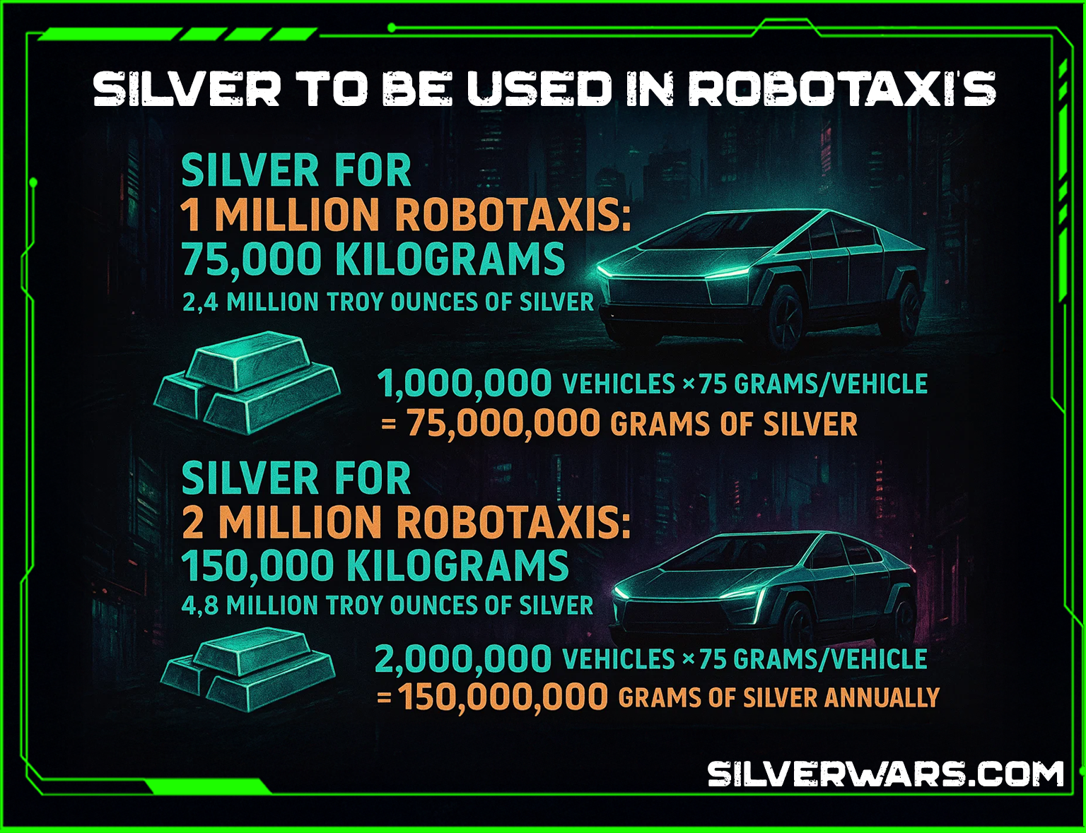 Let's do some quick math with a conservative estimate of, say, 75 grams of silver per Tesla robotaxi/Cybercab, considering their extensive electronics.