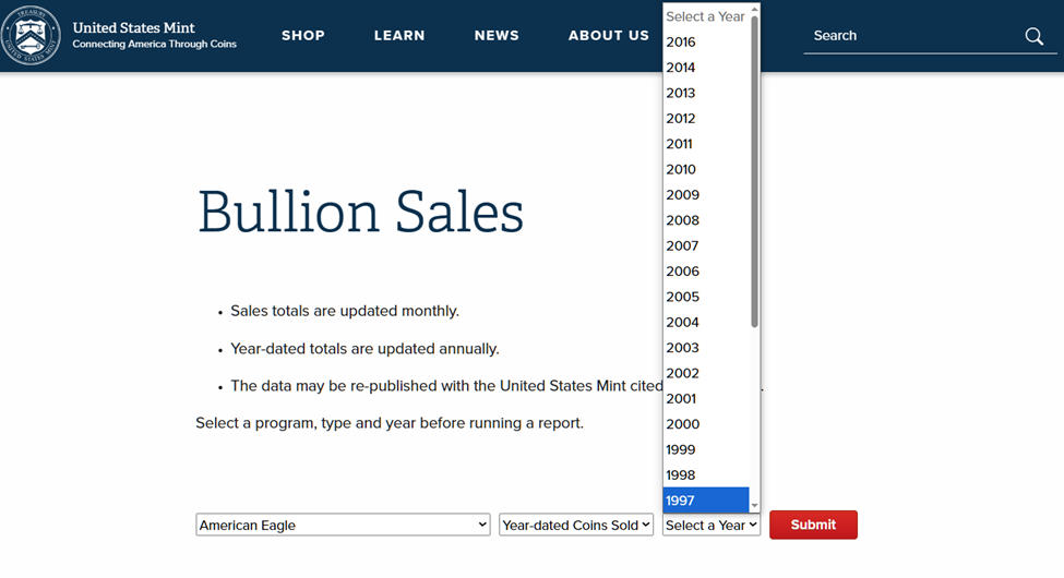 Data for 2017 – 2024 has been removed from the US Mint website for unknown reasons. 2015 is also missing.