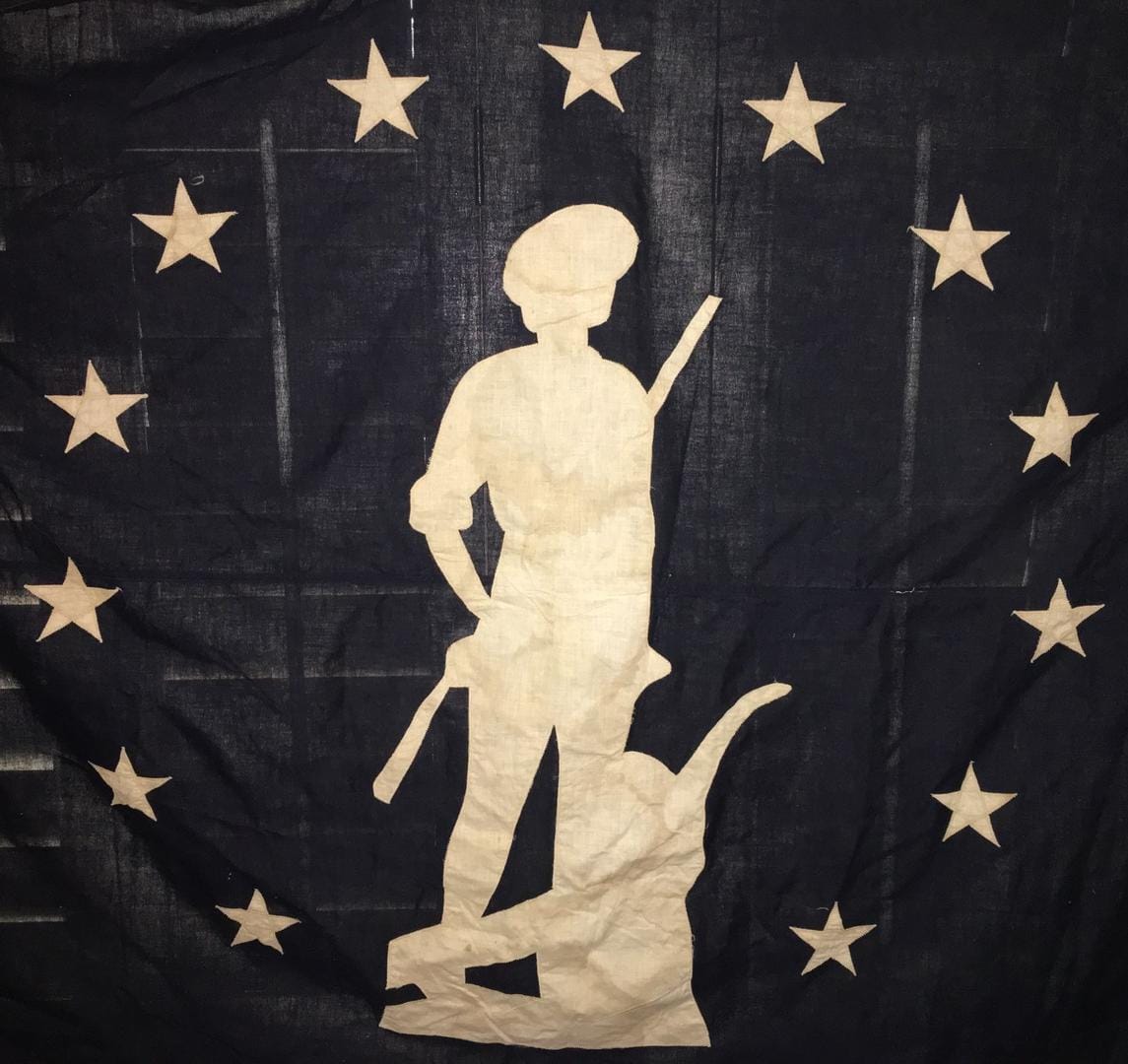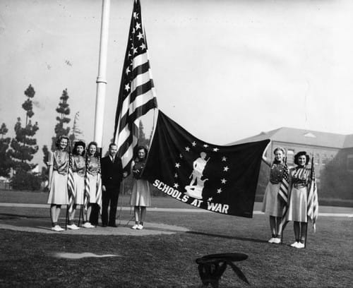 LEFT: Mr. Wood and Fremont High School girls' drill team displaying Minute-Man flag | RIGHT: Color Example